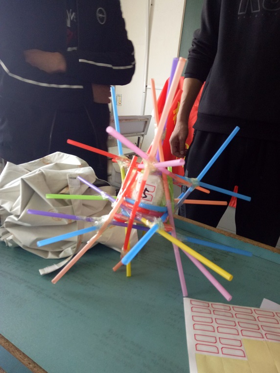 本次大赛面向我校全体全日制在校学生,旨在加强我校学生科学和实践的能力,激发潜能。大赛涉及物理学压强,冲量,空气阻力,物体平衡等科学原理;主要设计方法有:降落伞型,外包装型,多面体型,吸管组型等。要求将一枚普通生鸡蛋由四楼抛至外面水泥地,不破裂,而且下落速度最快,所用装置最轻,着陆最准确,得分最高。在紧张、激烈比拼之后,几位同学设计的装置脱颖而出,经过工作人员的点评计算,最终得出了用时最少、质量最轻、落地最准的装置组合。