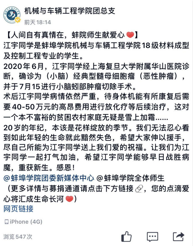 亲爱的老师们,亲爱的同学们,请伸出您温暖的双手,奉献您无限的爱意,送去您力所能及的支持,以实际行动、用我们的爱去帮助江宇同学打气加油,走出困境。请伸出您的友爱之手,献出您的关爱之情吧!只要人人都献出一点爱,世界会变成美好的人间!希望江宇同学能够早日战胜病魔,重获新生。感恩!