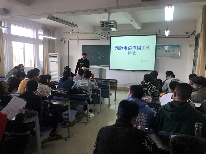为加强大学生识别电信和网络诈骗,防止学生财产安全受到侵害,2138CC太阳集团2018级各班级于4月下旬举行了一系列防范电信诈骗、防范“校园贷”等网络诈骗的主题班会,辅导员杨小东及2018级全体同学参加了主题班会。
