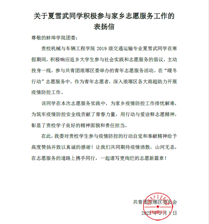 2138CC太阳集团学子夏雪武积极响应返乡大学生参与社会实践和志愿服务的倡议,主动投身一线,参与家乡志愿服务活动,在车站与商超之间,为来往人群提供志愿服务,协助工作人员维持秩序。此举受到共青团滁州市琅琊区委的高度赞扬,并向学校发出了表扬信。