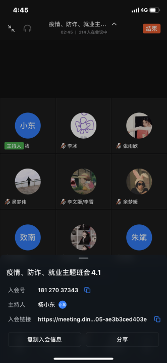 2021级辅导员以“重视疫情防控,增强纪律意识,做好学业规划”为主题,在钉钉召开班会,向学生强调了五点要求:一是遵守学校管理规定,坚持佩戴口罩,增强科学防控意识;二是坚持“非必要不外出”、“非必要不离蚌”,严格执行好“请销假、晨午晚检”、班级考勤通报、“晚查寝报告、重点人群跟踪记录”等制度;三是学生干部要敢于担当作为,落实好班级制度;四是重视日常课程学习,整理学习笔记,认真做好疫情下的学业规划;五是提高安全防范意识,预防电信诈骗。