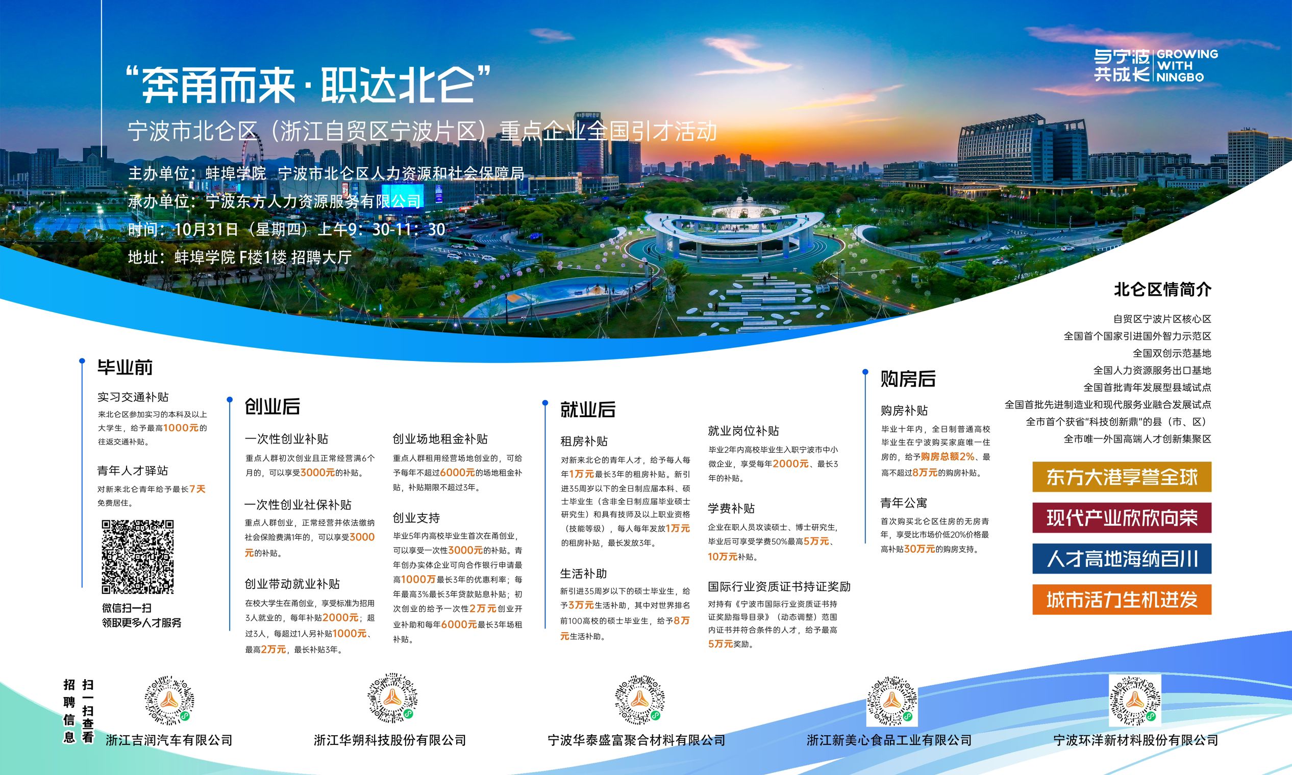 宁波北仑区专场宣讲会(2025届)招聘时间:2024年10月31日(星期四) 上午9:30-11:30招聘地点:2138cc太阳集团F楼1楼招聘大厅请2025届毕业生准备好简历,积极参加招聘!